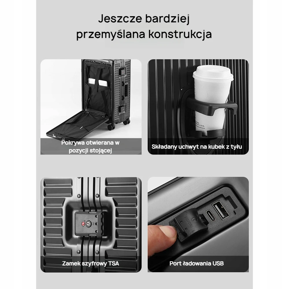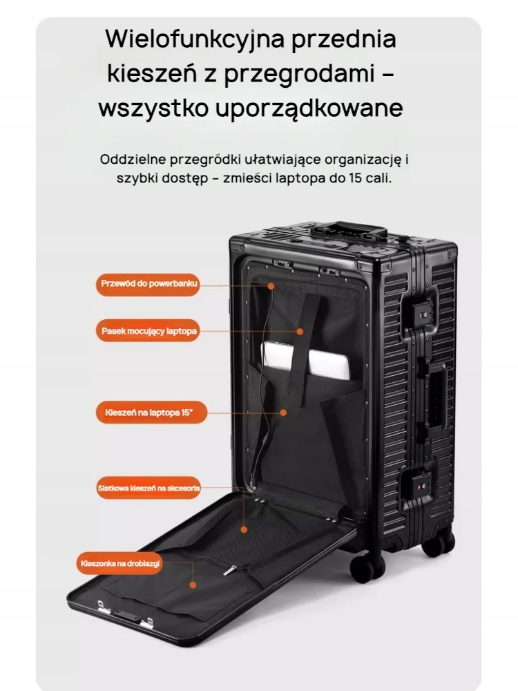 walizka kabinowa 20 cali | walizka aluminiowa | walizka z USB | walizka biznesowa | walizka podręczna TSA | walizka z otwieranym przodem | nowoczesna walizka | elegancka walizka na laptopa | walizka z zamkiem TSA | walizka z portem ładowania