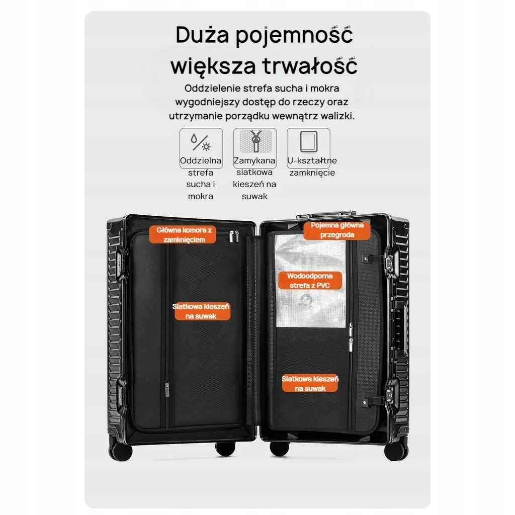 Przemyślane wnętrze: Dwa oddzielne przedziały – suchy i mokry – łatwa organizacja bagażu.